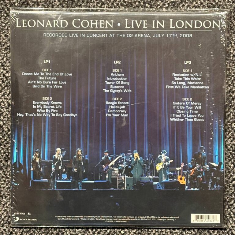 Leonard Cohen، شاعر، ترانه‌سرا و خواننده‌ی کانادایی، با صدای عمیق و اشعار فلسفی خود یکی از ماندگارترین چهره‌های تاریخ موسیقی است. آلبوم Live in London 2008 ثبت یکی از مهم‌ترین بازگشت‌های او به صحنه‌ی موسیقی پس از سال‌ها سکوت و کناره‌گیری است. این اجرا در سالن O2 Arena لندن برگزار شد و بعدها در قالب صفحه گرامافون سه‌لوحه‌ای (3LP) منتشر گردید. نسخه‌ی وینیل این آلبوم برای دوستداران موسیقی و کلکسیونرها تجربه‌ای بی‌نظیر و ارزشمند به شمار می‌رود.